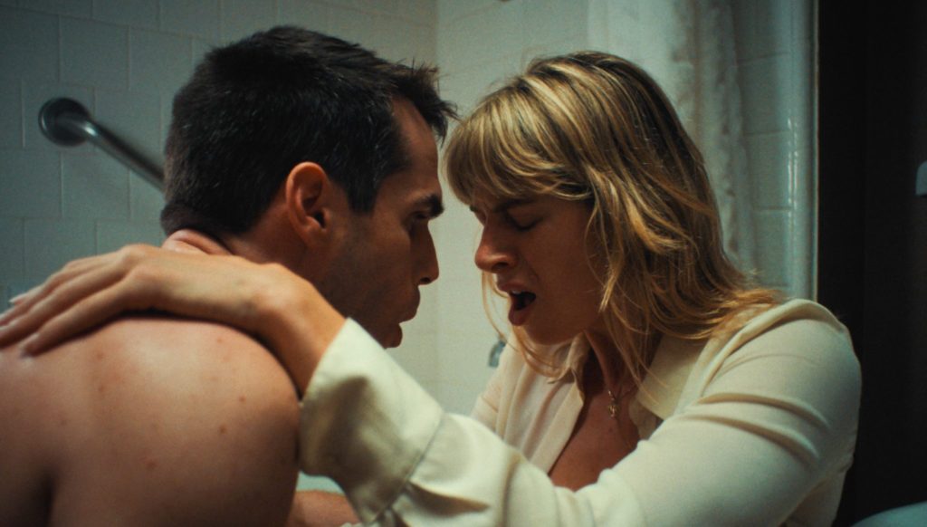 By the time Alex has called Carey for help, the film plays with us more. Carrey’s ensuing help for Alex is filmed in the motel bathroom as if it were a Hollywood sex scene – all fast cutting, implied nudity, moaning and sweaty holding on to bathroom appliances. Knowing the true situation renders the scene, in and of itself, very funny. But it’s also highly satirical and subversive, confronting us with how much mainstream media both informs an idea of sexuality that is often idealised and sanitised, but also one in which bodily functions – especially female ones – are made non-existent. At one point, Carrey has menstrual blood on his forehead. It wouldn’t be unthinkable that, if this were a mainstream movie, this would cause an R rating and much consternation amongst a certain tranche of commentators. But if that was blood that was splashed by gunning down a raft of evildoers, we’d be in PG13 territory and completely fine as long as no one said ‘fuck’ more than twice.